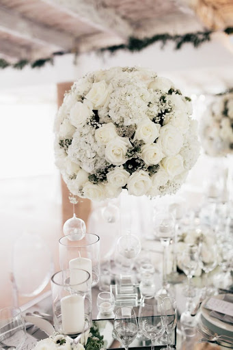 Romantic All White Wedding Centrepiece With Mirrored Base For That Clean Look White Wedding Centerpieces Wedding All White Wedding